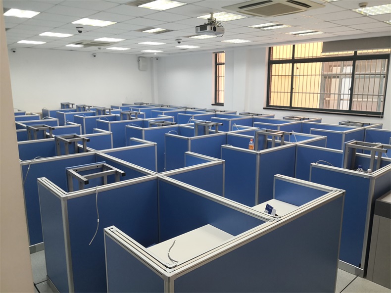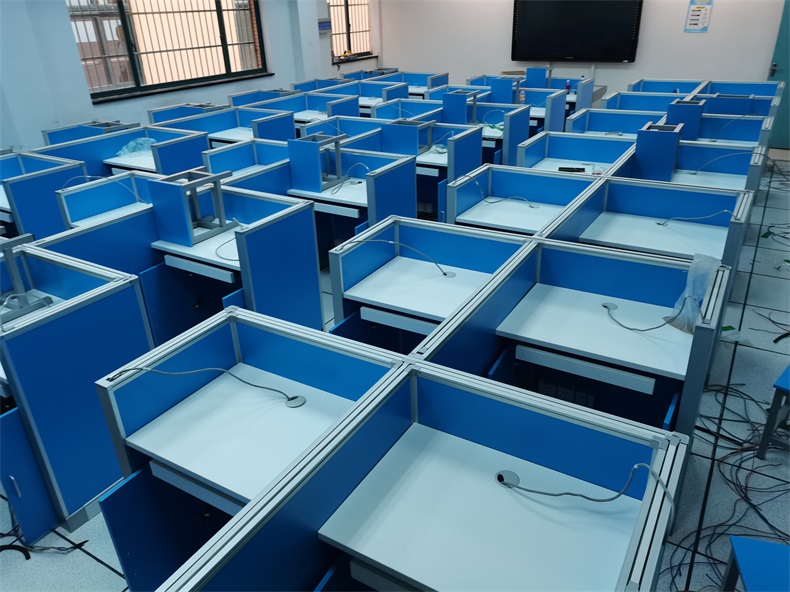 根據(jù)上海科技管理學校對測試實驗實訓室和編碼實訓室使用需求,在產(chǎn)品設計方面,電腦桌的左、右、前三面帶升降屏風擋板,用于隔斷相鄰考生視線。當屏風升起時,可以用作教室計算機標準化考試使用,當屏風降下時,可以用于學生上課使用。實現(xiàn)了一室多用、考學合一。