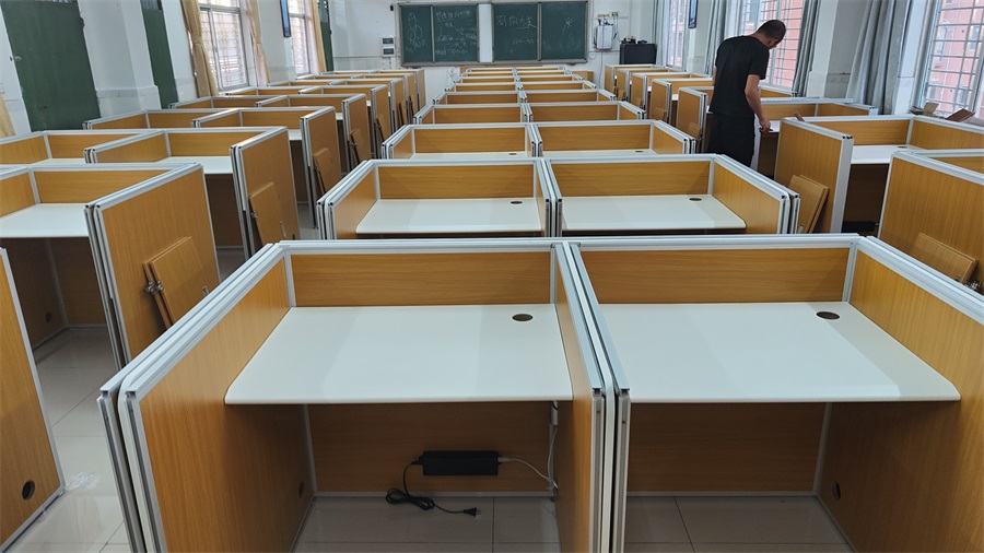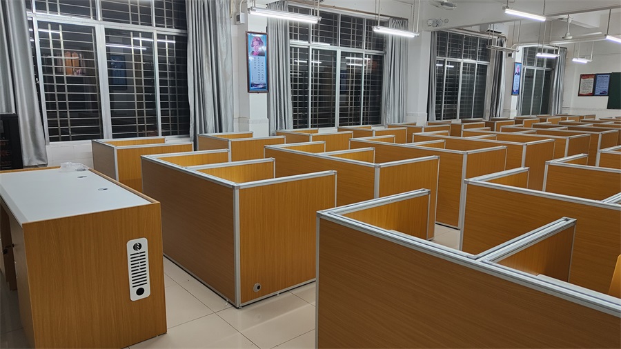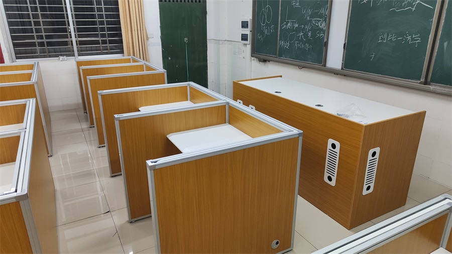 根據廣東梅州興寧實驗學校對升降屏風語音教室的使用需求,方方智能對該教室設計了一套可以升降的智能升降屏風桌,每個座位都有可升降的屏風,考試時屏風升起后可有效的隔斷相鄰人的正常視線,防噪音效果,可達到互不干擾的作用,當屏風降下時,可以用于學生日常上課使用。實現了一室多用、考學合一。