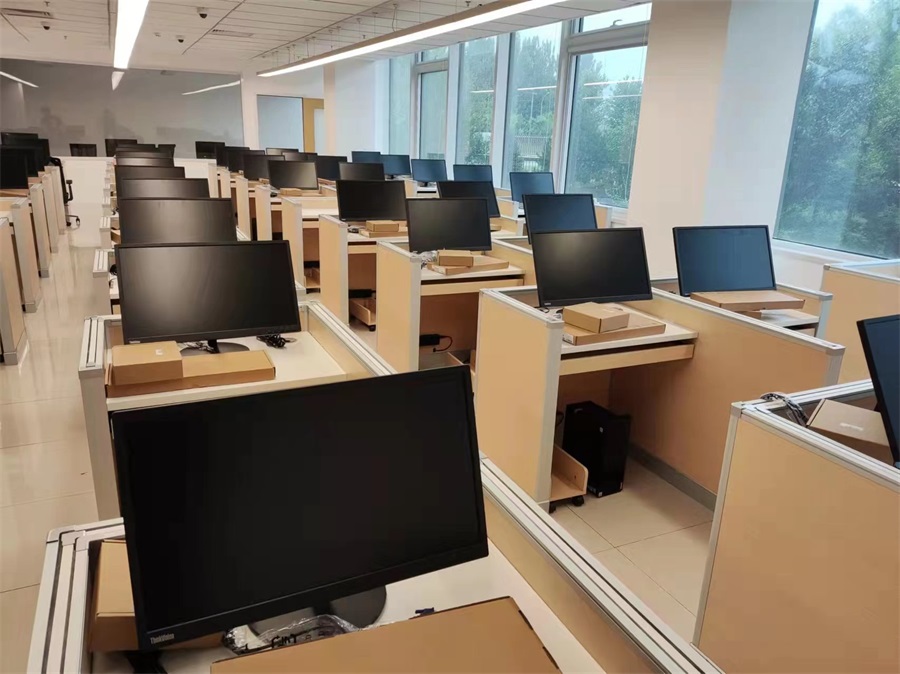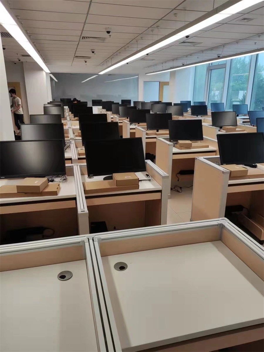 根據北京清華附中外籍人員子女學校對升降屏風語音教室的使用需求,方方智能對該教室設計了一套可以升降的智能升降屏風桌,每個座位都有可升降的屏風,考試時屏風升起后可有效的隔斷相鄰人的正常視線,防噪音效果,可達到互不干擾的作用,當屏風降下時,可以用于學生日常上課使用。實現了一室多用、考學合一。