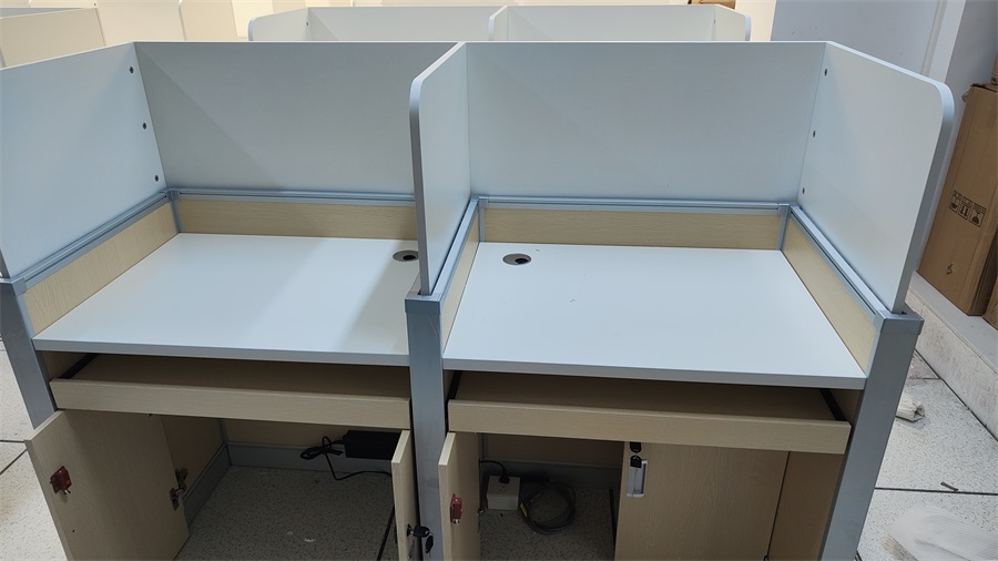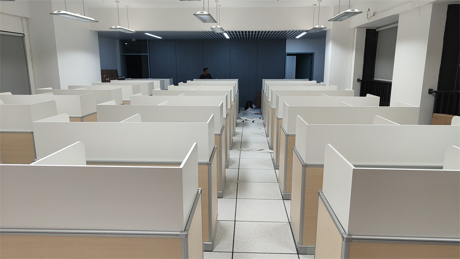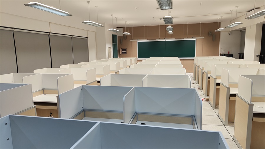 根據深圳市龍華區龍騰學校對升降屏風語音教室的使用需求,方方智能對該教室設計了一套可以升降的智能升降屏風桌,每個座位都有可升降的屏風,考試時屏風升起后可有效的隔斷相鄰人的正常視線,防噪音效果,可達到互不干擾的作用,當屏風降下時,可以用于學生日常上課使用。實現了一室多用、考學合一。