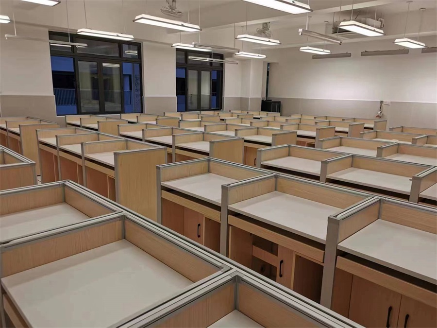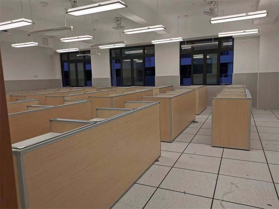 根據深圳市教育科學研究院實驗學校對升降屏風語音教室的使用需求,方方智能對該語音室設計了一套可以升降的智能升降屏風桌,每個座位都有可升降的屏風,考試時屏風升起后可有效的隔斷相鄰人的正常視線,防噪音效果,可達到互不干擾的作用,當屏風降下時,可以用于學生日常上課使用。實現了一室多用、考學合一。