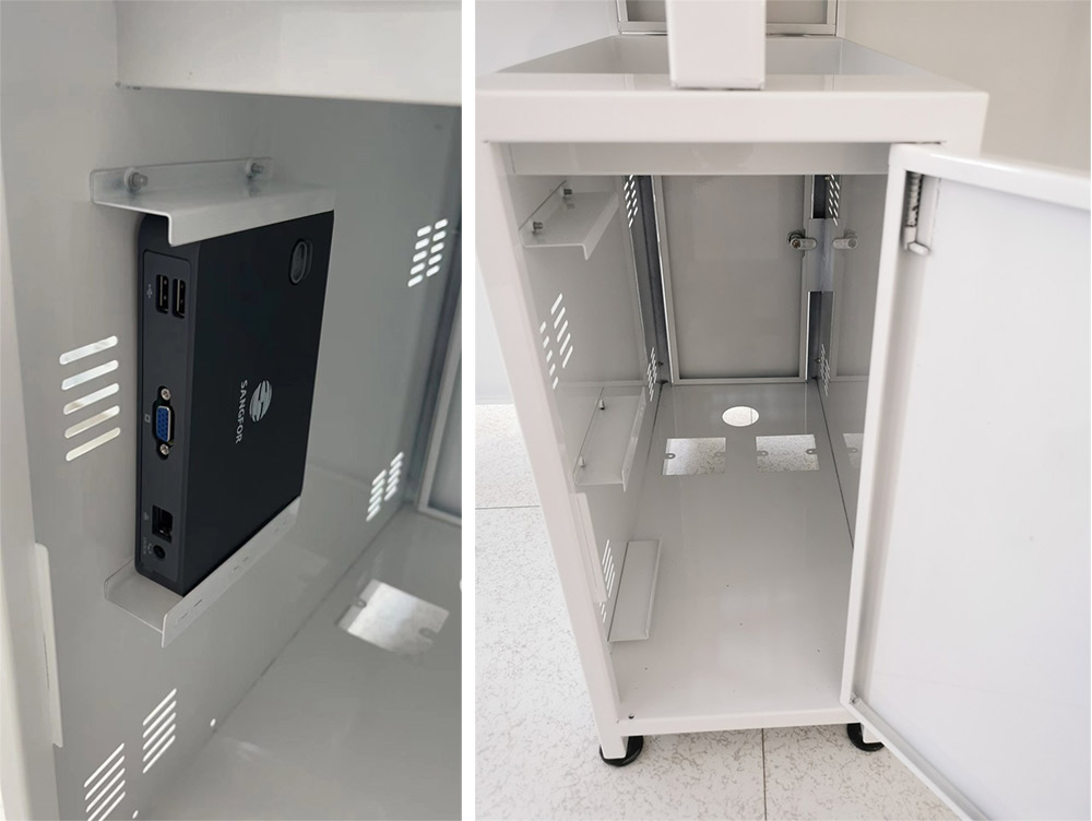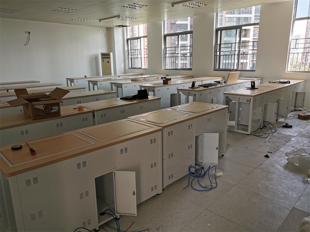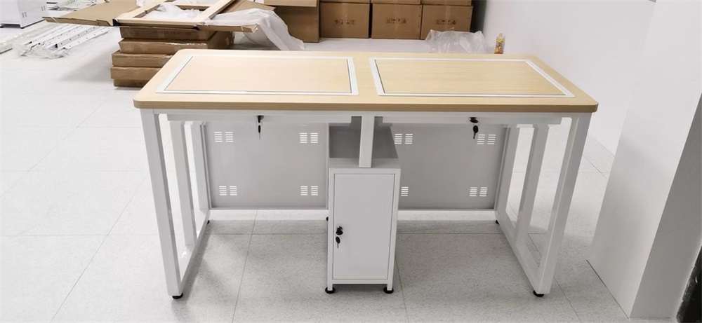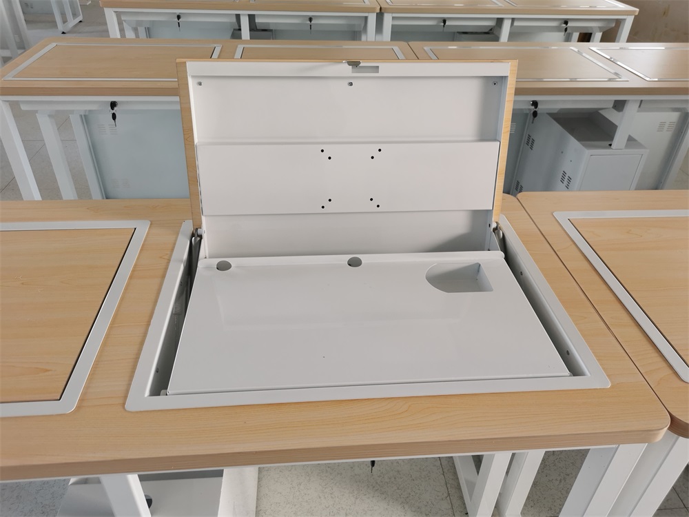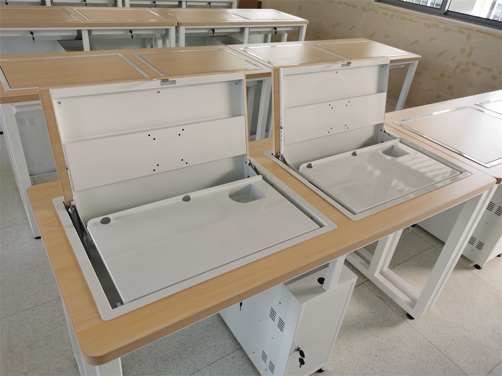 根據(jù)深圳市龍崗區(qū)麓城外國語小學計算機教室使用要求,方方智能為該學校設計了電腦翻轉(zhuǎn)桌。翻轉(zhuǎn)器與電腦桌配套使用,拉動開關(guān)按鈕液晶顯示屏會自動翻起,鍵盤也同時升起與桌面齊平;當不需要使用電腦時,可用手動按下翻蓋面板,整個翻轉(zhuǎn)器與桌面齊平,和普通的教室無異。產(chǎn)品具有防盜、防塵保持桌面平整,美化桌面等功能,電腦桌內(nèi)還可以存放各類文具和學習用品,實現(xiàn)普通教室與計算機教室模式相互切換快速,不阻礙老師與學生之間目光交流,滿足一教室多用的需求。