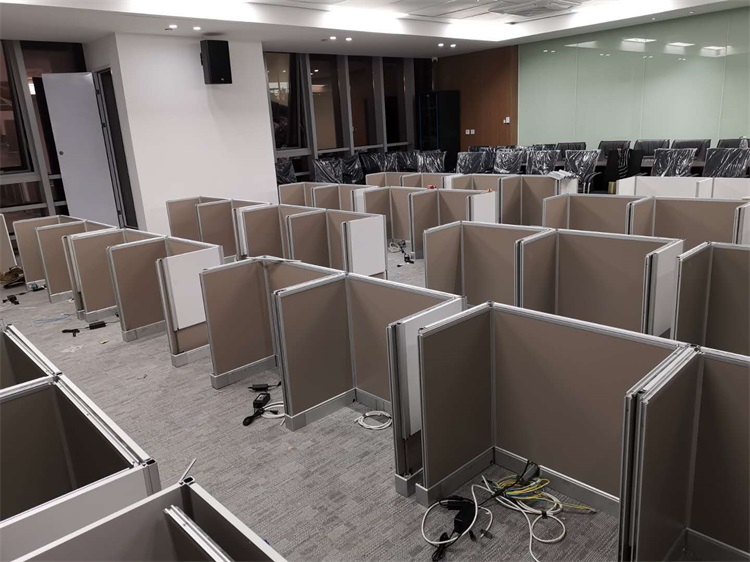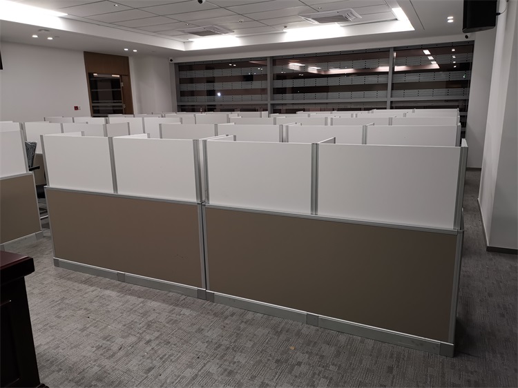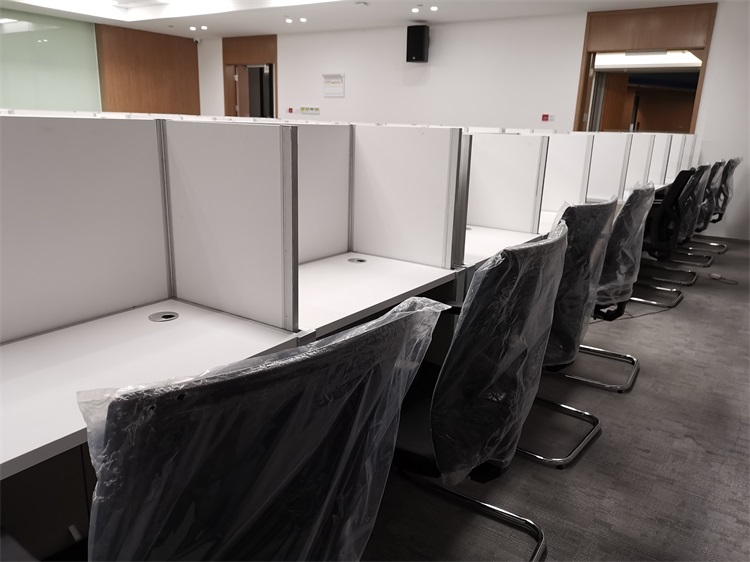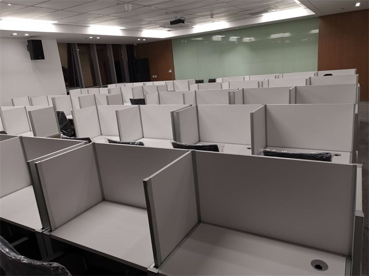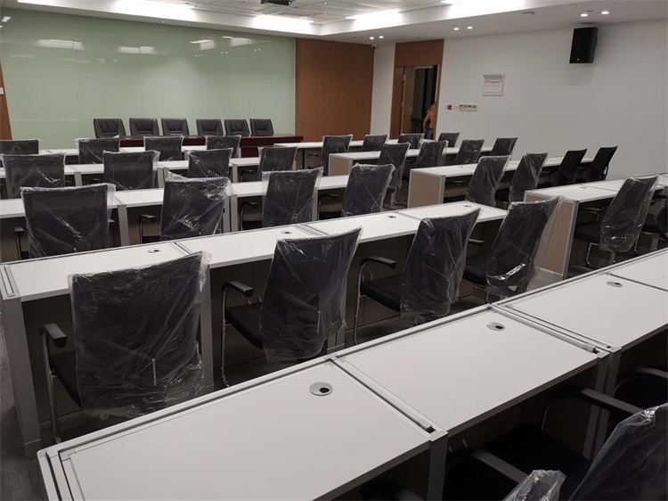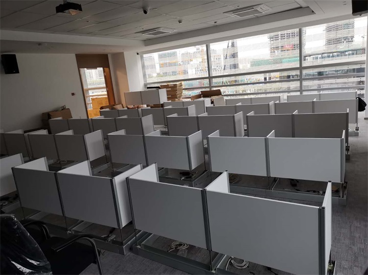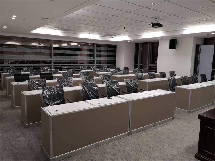 根據珠海市金灣區市民服務中心多媒體教室使用需求,本次語音聽說測試考場,結合教室空間布局,設計了20套雙人位智能升降屏風桌,每個座位都有可升降的屏風,屏風升起后可有效的隔斷相鄰人的正常視線,防噪音效果,可達到互不干擾的作用;不需要屏風時,屏風降下。和普通的教室無異,滿足一教室多用的需求。智能升降屏風教室還有投影大屏顯示系統、拾音系統、視頻跟蹤錄像系統、高保真擴音系統、提升教學質量,滿足公務員對現代智能教室的要求。