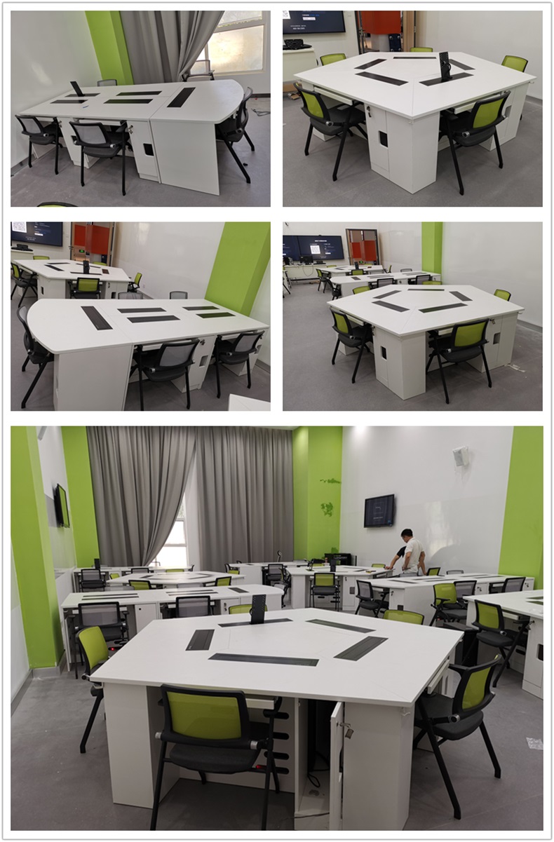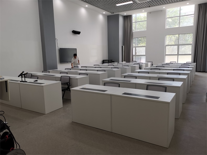 根據深圳職業技術學院對多媒體教室使用要求,方方智能為該學校設計了每個桌子桌面裝有液晶屏升降器,需要使用顯示屏時,隱藏在桌子內部的液晶升降器把顯示屏從桌子下面升出桌子上面;當不使用顯示屏時,液晶屏升降器自動下降,顯示屏隱藏在桌子內部,起到防盜、防塵作用,保持桌子表面的平整和美觀,實現了一室多用。 |