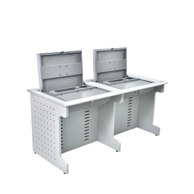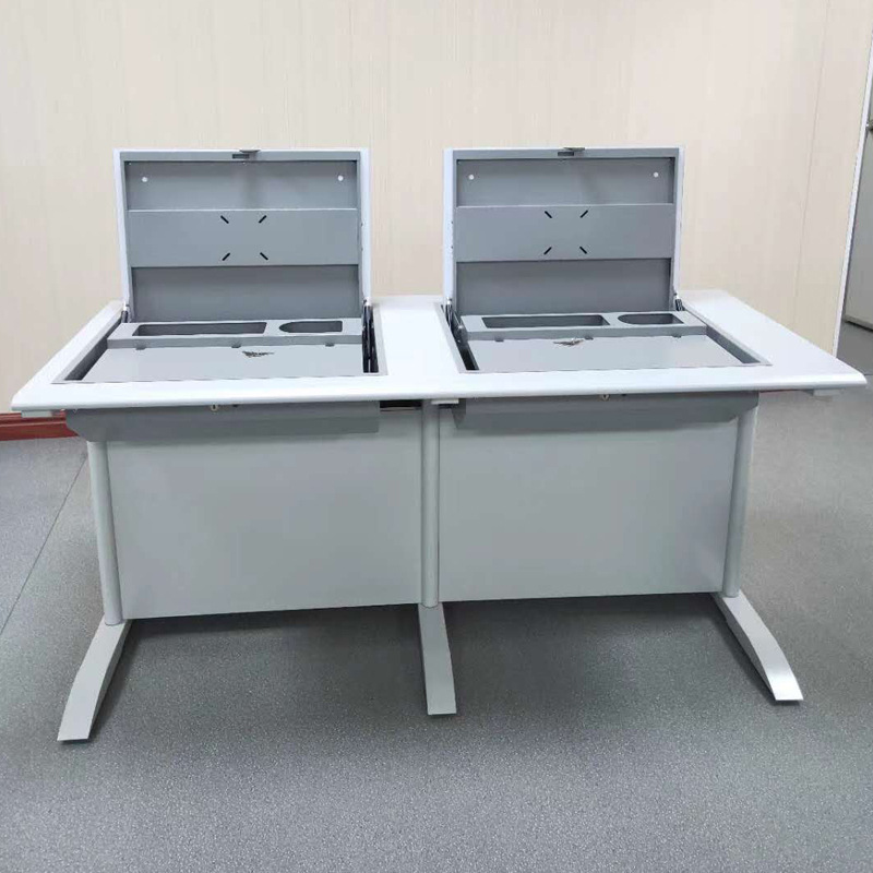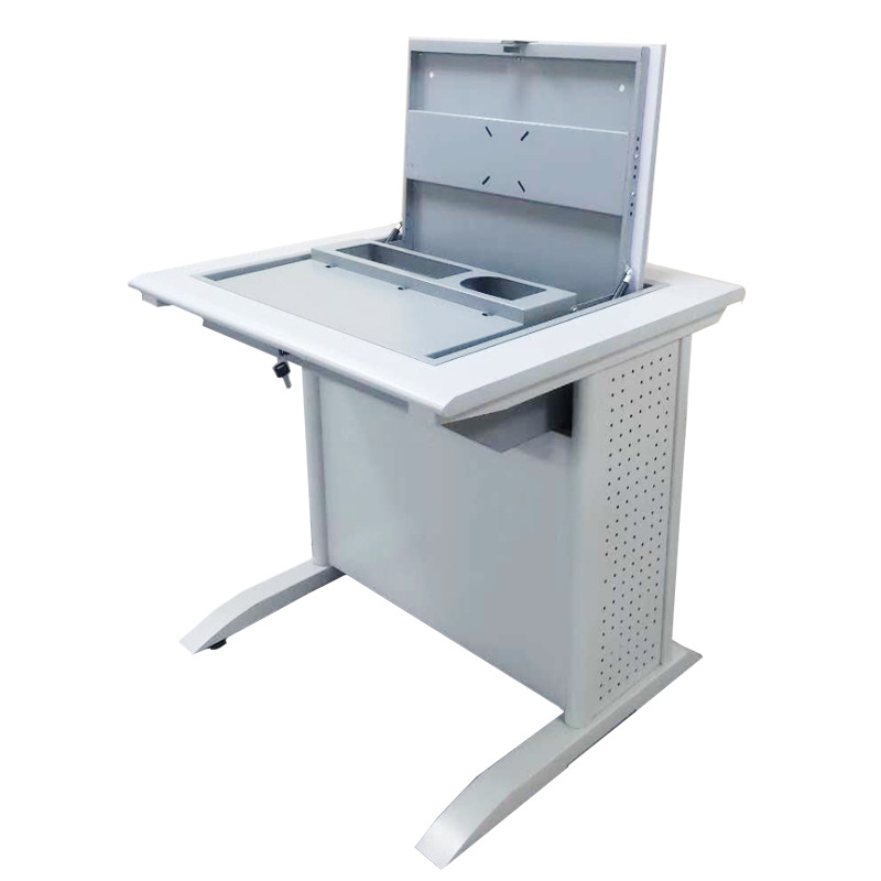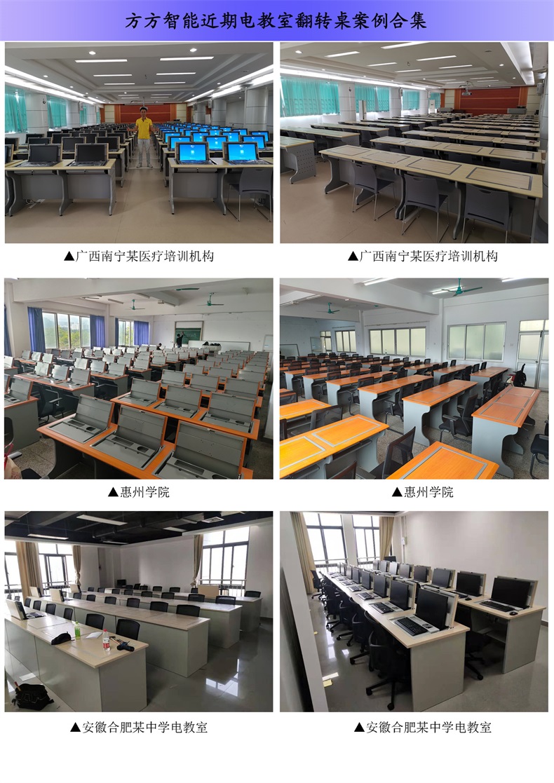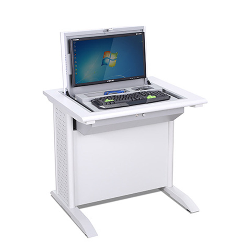 電腦翻轉桌,翻轉器與電腦桌配套使用,拉動開關按鈕液晶顯示屏會自動翻起,鍵盤也同時升起與桌面齊平。當不需要使用電腦時,可用手動按下翻蓋面板。整個翻轉器與桌面齊平,和普通的教室無異,產品具有防盜、防塵保持桌面平整,美化桌面等功能。電腦桌內還可以存放各類文具和學習用品,滿足一教室多用的需求。 資訊熱線:0760-88661059